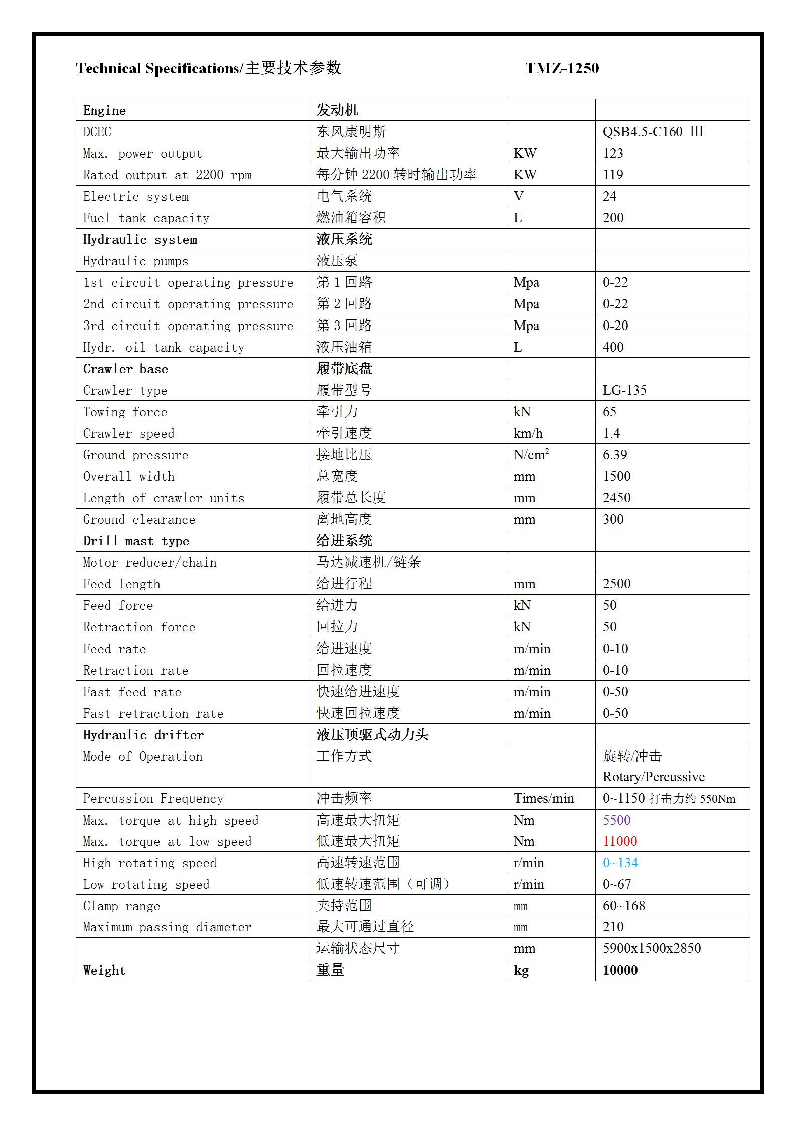 TMZ-1250 hydraulic anchor drilling rig is designed specially been used for anchor borehole drilling in small tunnels and narrow spaces, with compact strueture and articulation system with multi-direction positioned rotation table it can be used for multi-position and multi-angle anchor borehole drilling.